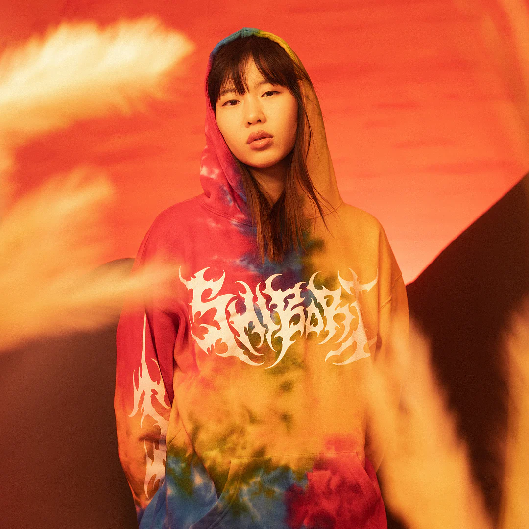 In stock and shipping now. Limited run. Unisex. Rainbow tie dyed Hollow Skull graphic hoodie with front and back print.